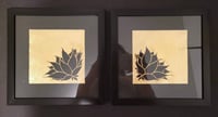 Pair of bookend-inspired black lotus blossoms painted on imitation gold leaf. Set in 8x8" black frames.